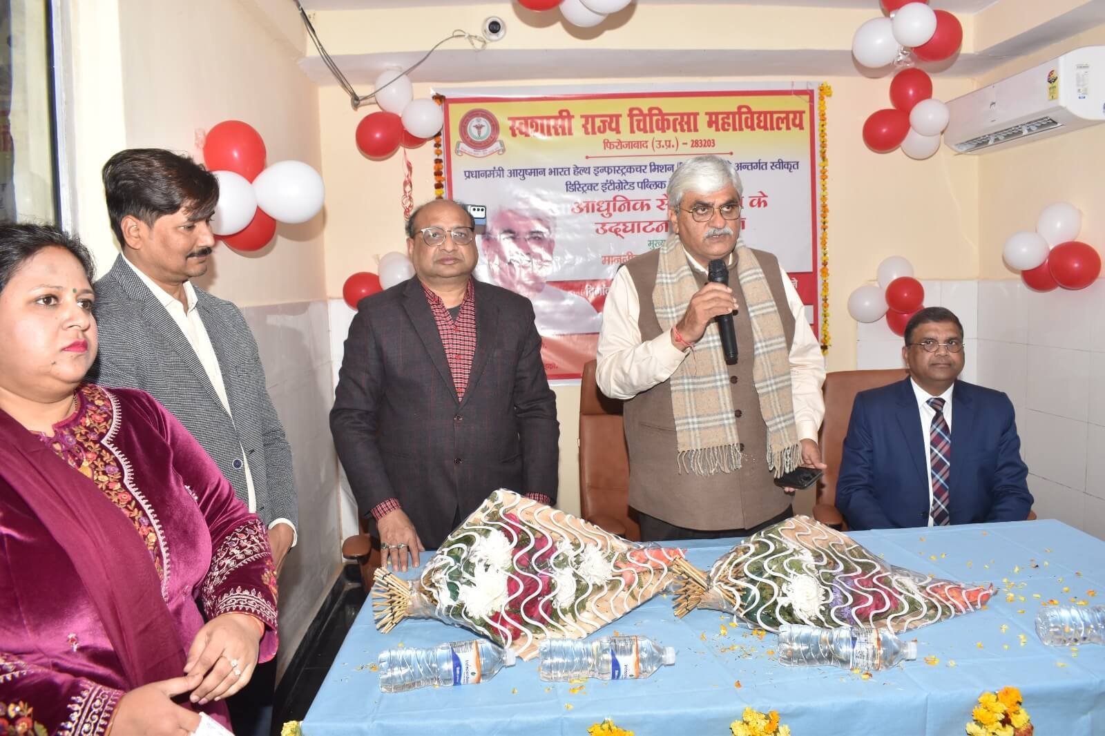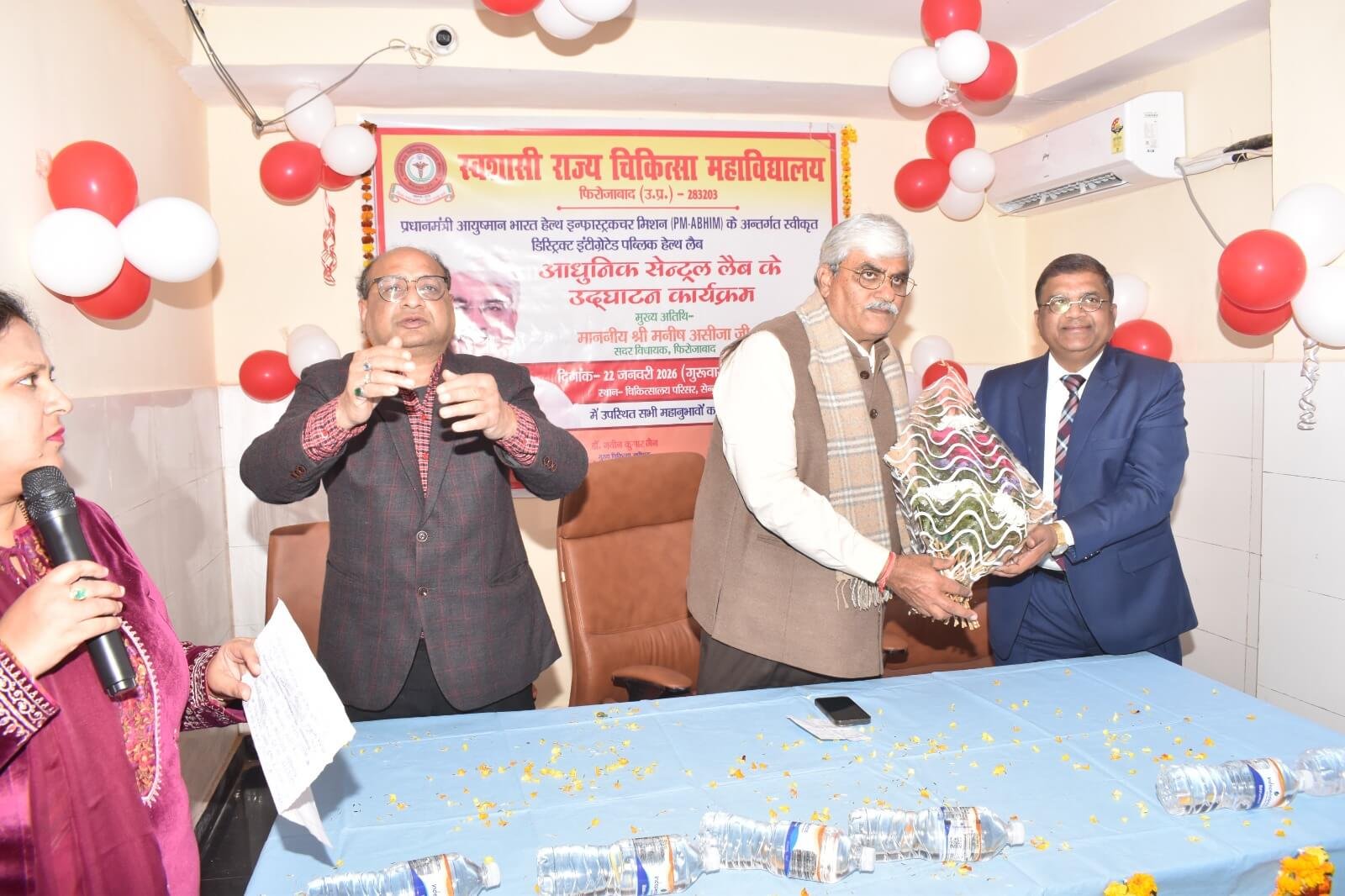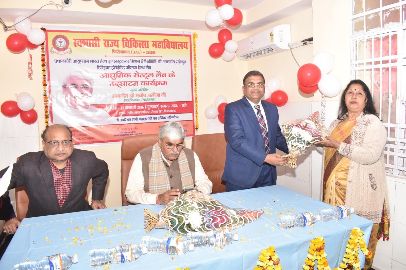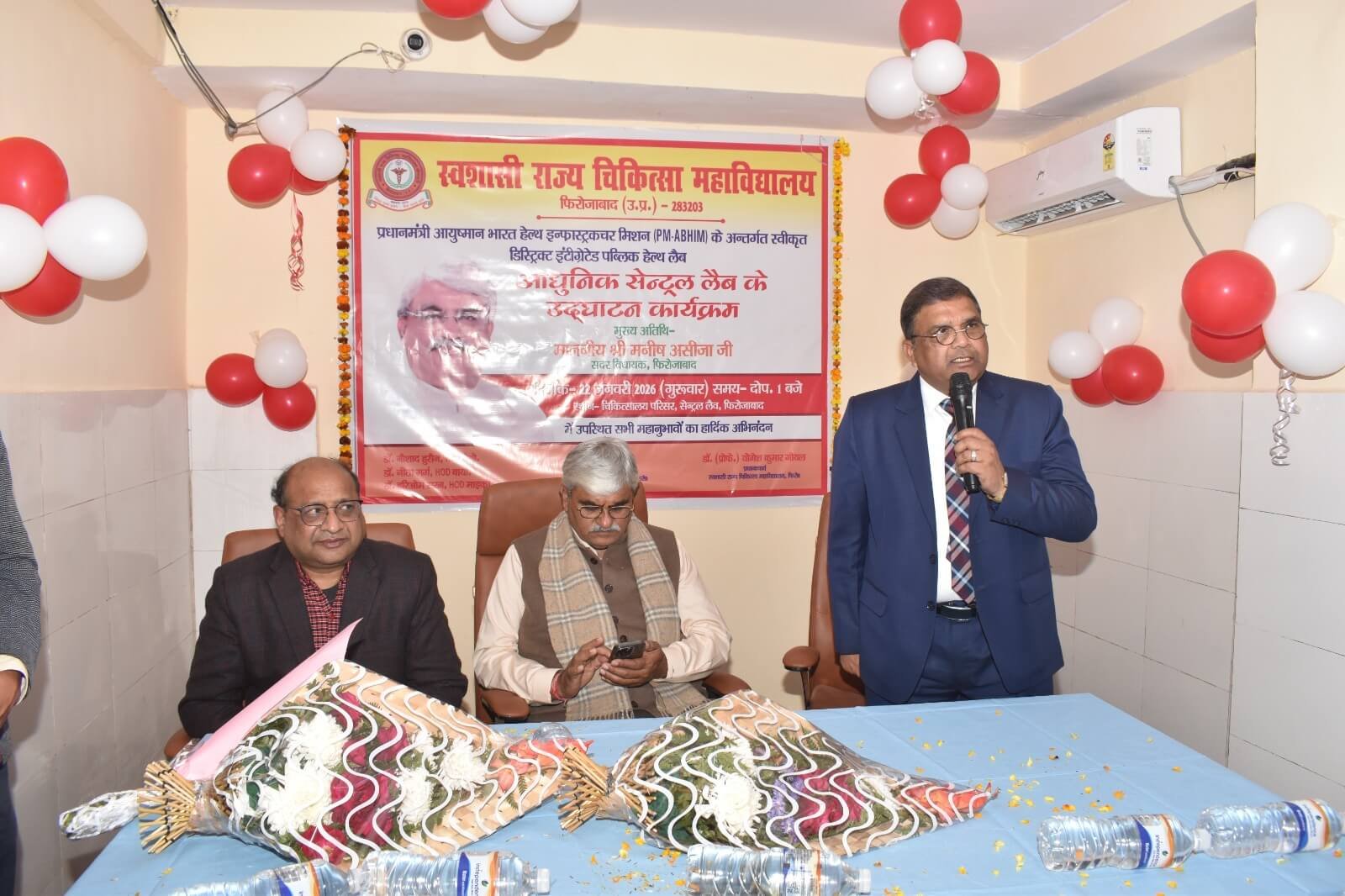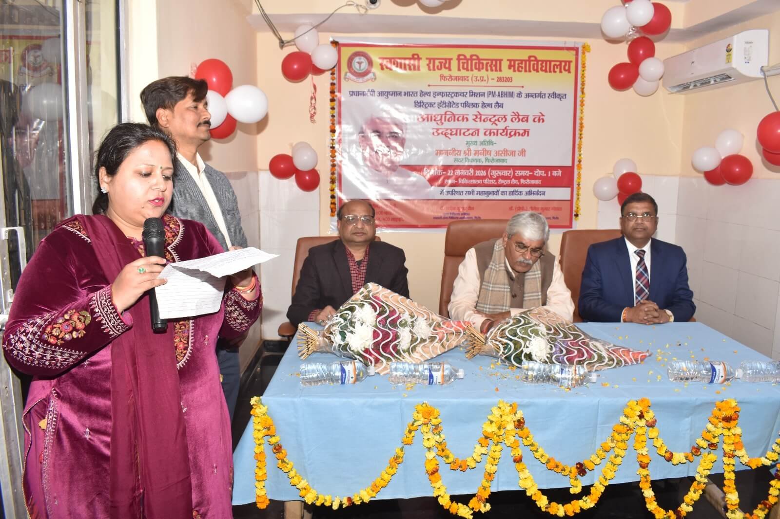 आज दिनांक 22.01.2026 को प्रधानाचार्य डॉ.(प्रो.) योगेश कुमार गोयल के मार्गदर्शन में स्वशासी राज्य चिकित्सा महाविद्यालय, फिरोजाबाद के चिकित्सालय परिसर में प्रधानमंत्री आयुष्मान भारत हेल्थ इन्फ्रास्ट्रक्चर मिशन (PM-ABHIM) के अन्तर्गत स्वीकृत डिस्ट्रिक्ट इंटीग्रेटेड पब्लिक हेल्थ लैब के उद्घाटन कार्यक्रम का आयोजन किया गया। इस आधुनिक सेन्ट्रल लैब के उद्घाटन कार्यक्रम के मुख्य अतिथि मा0 श्री मनीष असीजा जी, सदर विधायक, फिरोजाबाद रहे। इस लैब में सभी जांचे एक ही स्थान पर उपलब्ध होगीं, आधुनिक मशीनों एवं तकनीक की उपलब्धता से बीमारीयों का पता जल्दी चल सकेगा एवं इससे जांच की रिर्पोट अधिक सटीक और विश्वसनीय मिलेगी। उक्त लैब का संचालन डा. नौशाद हुसैन, विभागाध्यक्ष पैथोलॉजी विभाग, डा. नीता गर्ग, विभागाध्यक्ष बायोकेमेस्ट्री विभाग, डा. हरिओम शरण, विभागाध्यक्ष माइक्रोबायोलॉजी विभाग द्वारा किया जायेगा। उक्त कार्यक्रम में समस्त विभागाध्यक्ष, संकाय सदस्य, सीनियर रेजीडेन्ट, जूनियर रेजीडेन्ट एवं समस्त कर्मचारीगण उपस्थित रहे।
