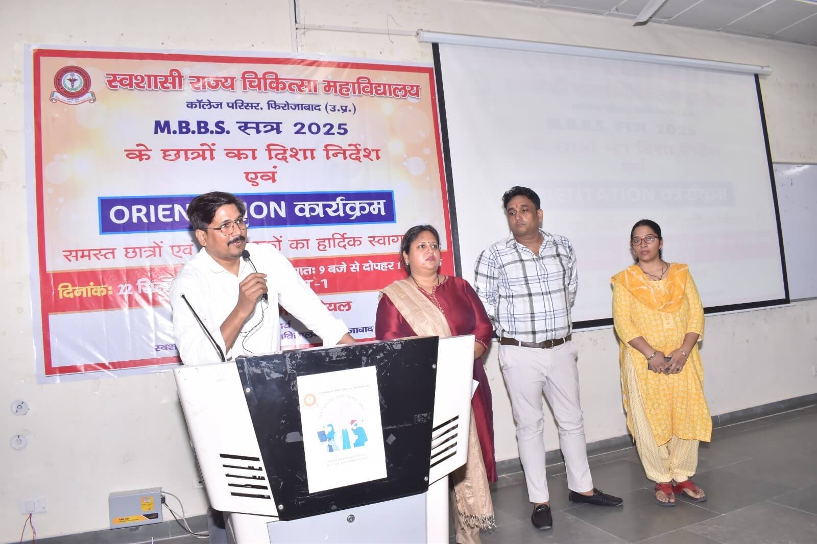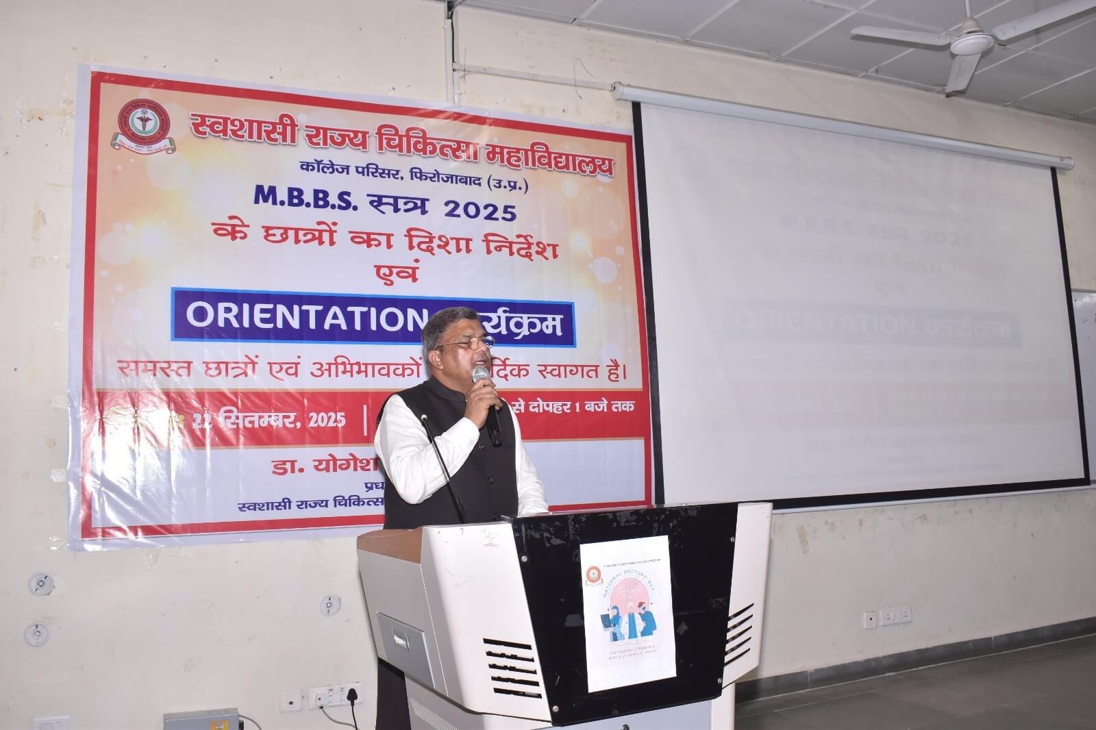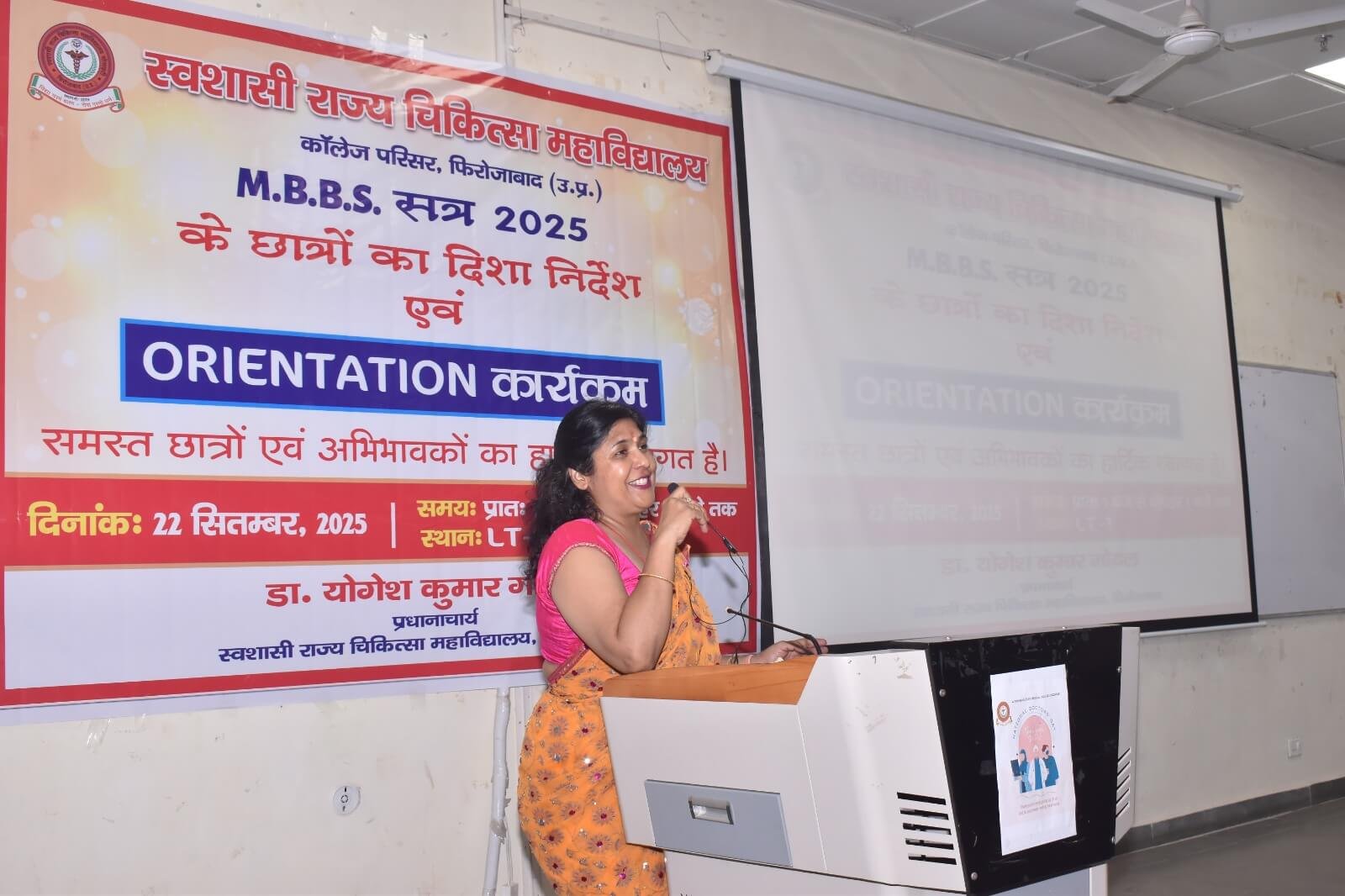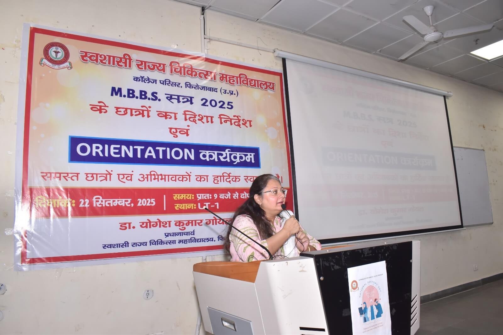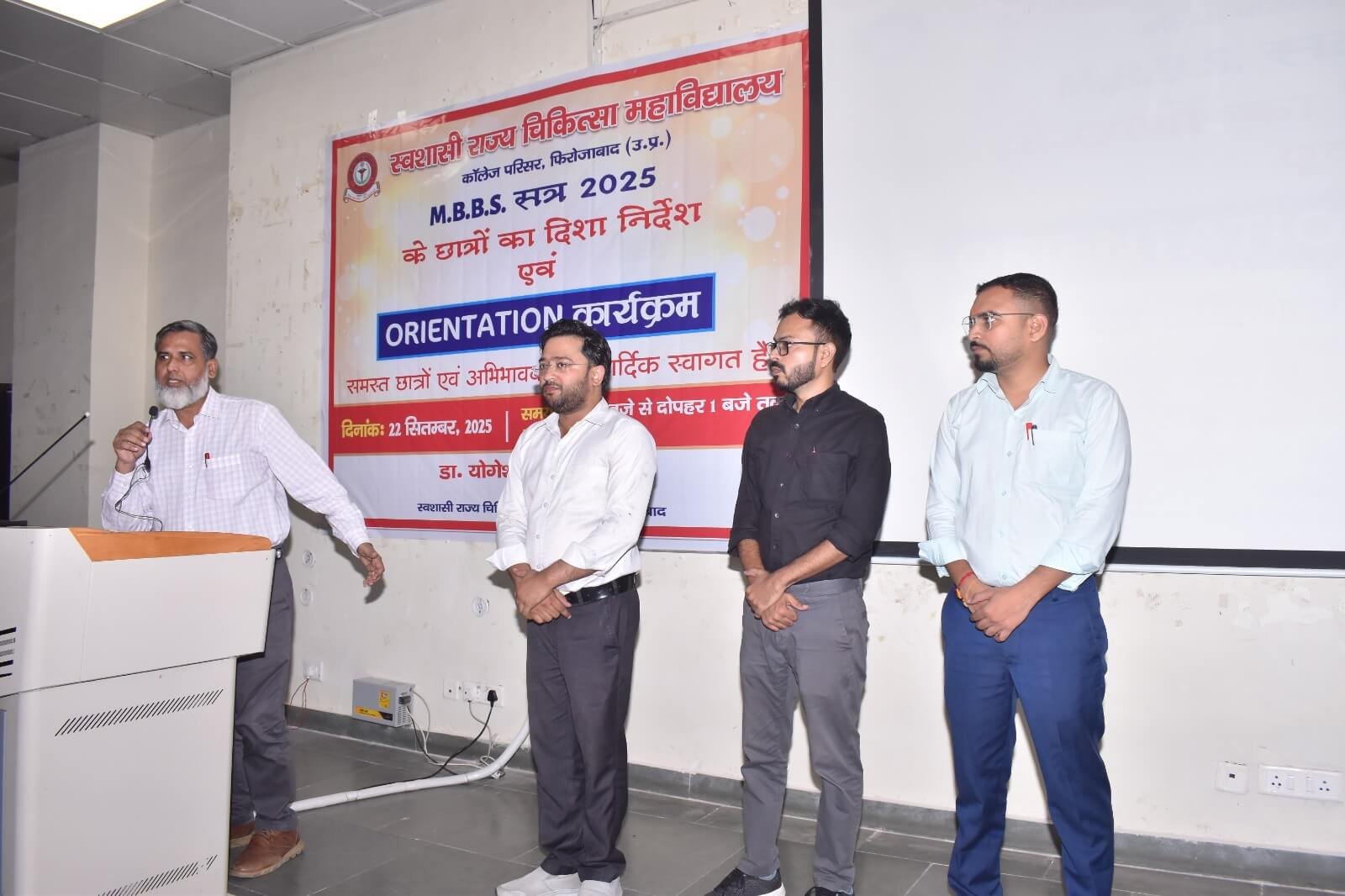 स्वशासी राज्य चिकित्सा महाविालय, फिरोजाबाद में दिनांक- 22.09.2025 को एम0बी0बी0एस0 सत्र-2025 बैच का शुभारम्भ ओरएन्टेशन कार्यक्रम के माध्यम से डॉ. योगेश कुमार गोयल, प्रधानाचार्य के मार्गदर्शन में किया गया। इस कार्यक्रम का मुख्य उद्देश्य छात्र-छात्राओं एवं अभिभावकों को स्वशासी राज्य चिकित्सा महाविद्यालय, फिरोजाबाद के कालेज एवं चिकित्सालय परिसर से अवगत कराना होता है। उक्त के दृष्टिगत विभिन्न विभागों एवं संकाय सदस्यों का परिचय, विभागाध्यक्ष, एनाटमी, फिजियोलॉजी, बायोकेमिस्ट्री के विचार प्रस्तुति, हॉस्टल एवं मैस का परिचय, एन्टी रैगिंग कमेटी एवं अनुशासन समिति द्वारा परिचय दिया गया। यह कालेज का 07 एम0बी0बी0एस0 बैच है। प्रथम एम0बी0बी0एस0 बैच-2019 इन्टर्नशिप करके उत्तीर्ण हो चुका है। हम इनके मंगल भविष्य की कामना करते है।