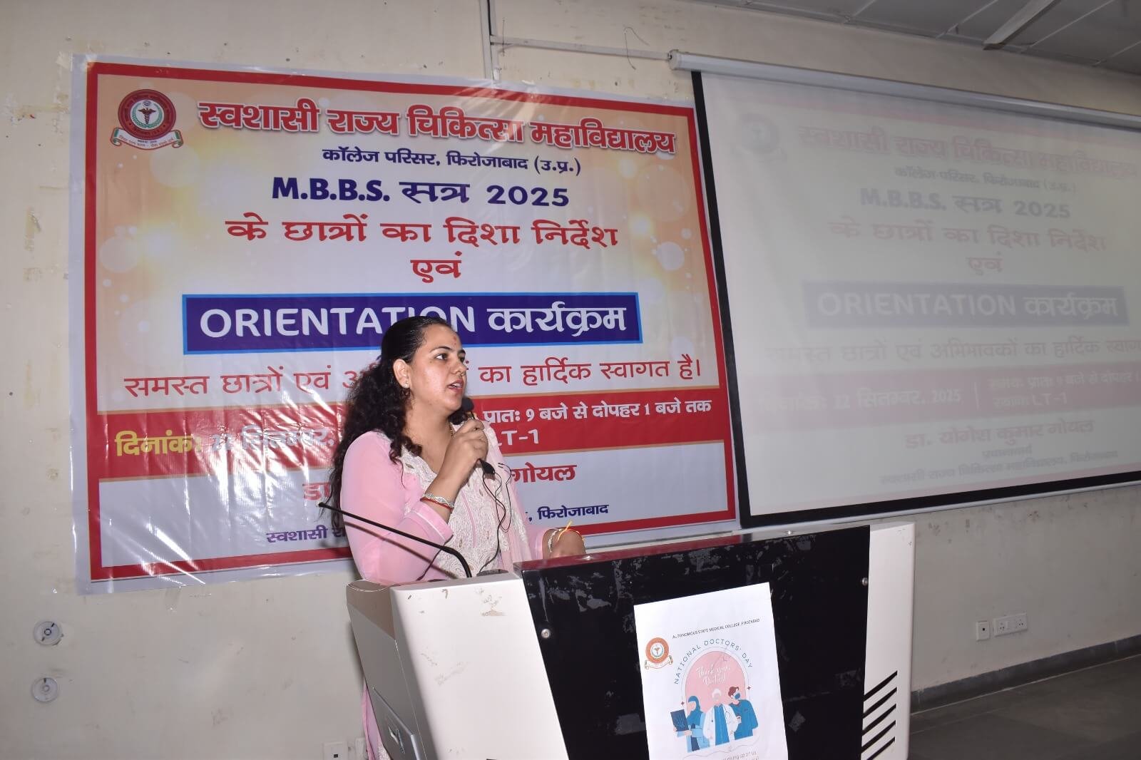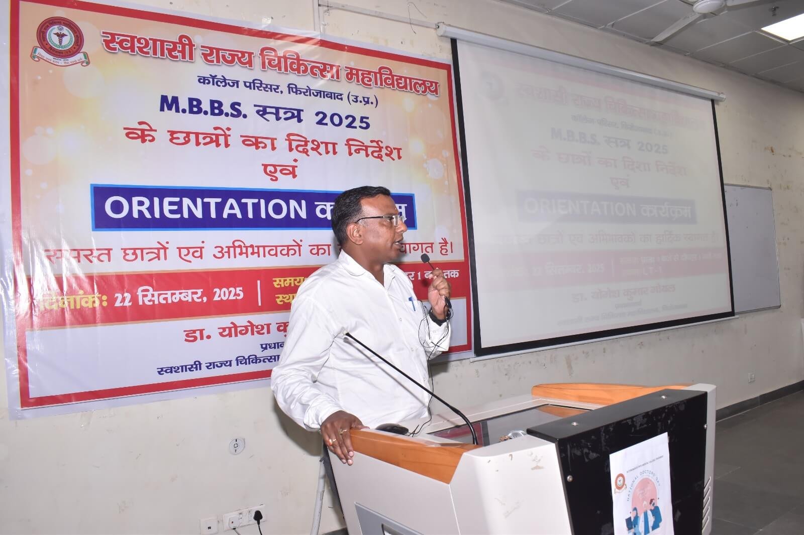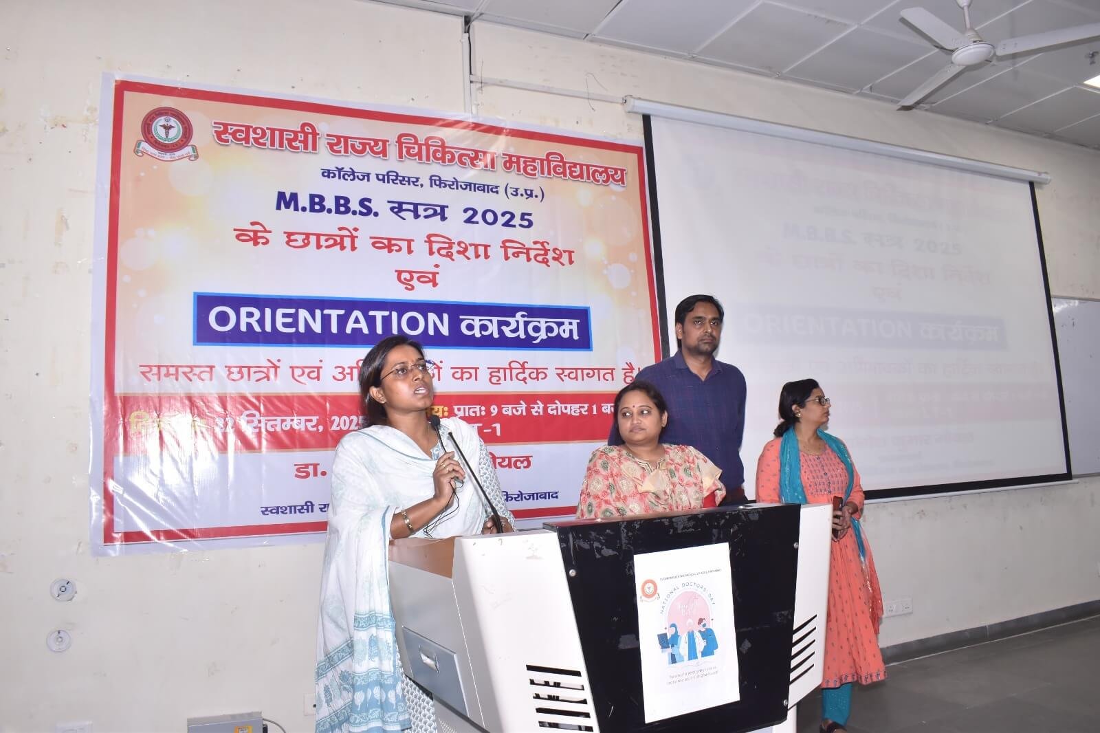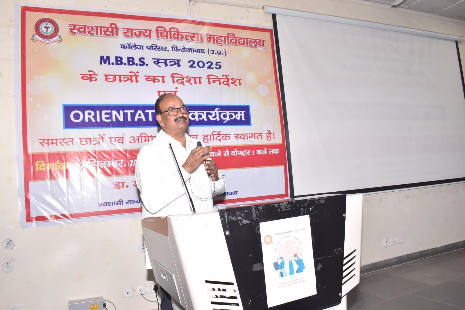 स्वशासी राज्य चिकित्सा महाविालय, फिरोजाबाद में दिनांक- 22.09.2025 को एम0बी0बी0एस0 सत्र-2025 बैच का शुभारम्भ ओरएन्टेशन कार्यक्रम के माध्यम से डॉ. योगेश कुमार गोयल, प्रधानाचार्य के मार्गदर्शन में किया गया। इस कार्यक्रम का मुख्य उद्देश्य छात्र-छात्राओं एवं अभिभावकों को स्वशासी राज्य चिकित्सा महाविद्यालय, फिरोजाबाद के कालेज एवं चिकित्सालय परिसर से अवगत कराना होता है। उक्त के दृष्टिगत विभिन्न विभागों एवं संकाय सदस्यों का परिचय, विभागाध्यक्ष, एनाटमी, फिजियोलॉजी, बायोकेमिस्ट्री के विचार प्रस्तुति, हॉस्टल एवं मैस का परिचय, एन्टी रैगिंग कमेटी एवं अनुशासन समिति द्वारा परिचय दिया गया। यह कालेज का 07 एम0बी0बी0एस0 बैच है। प्रथम एम0बी0बी0एस0 बैच-2019 इन्टर्नशिप करके उत्तीर्ण हो चुका है। हम इनके मंगल भविष्य की कामना करते है।