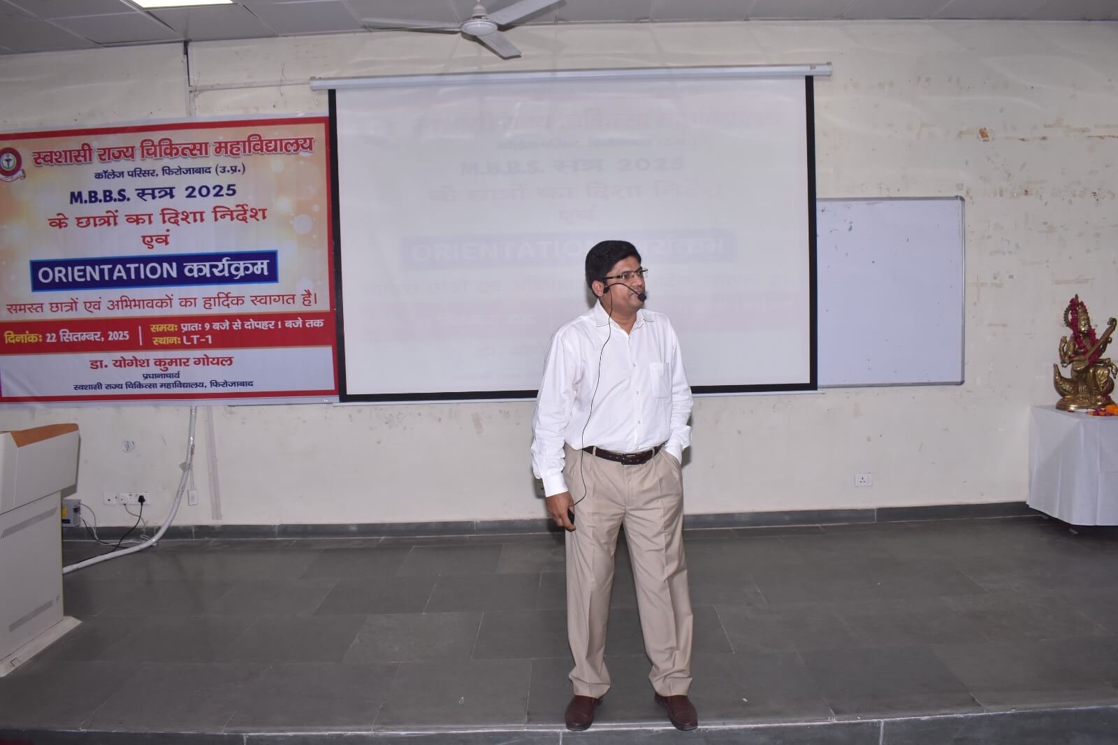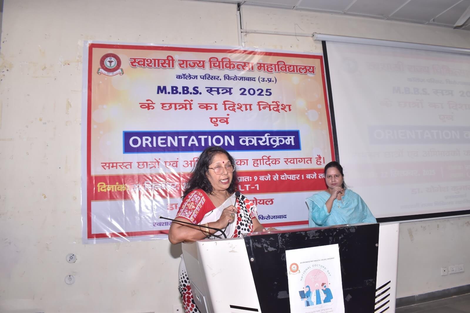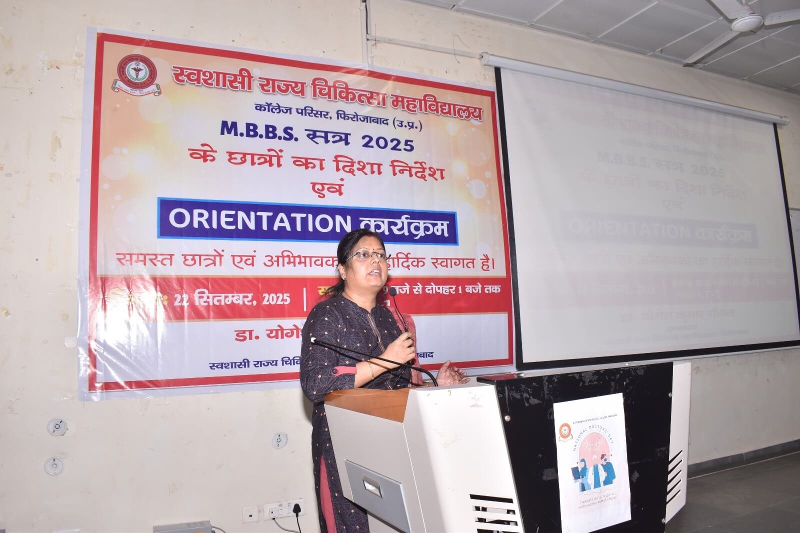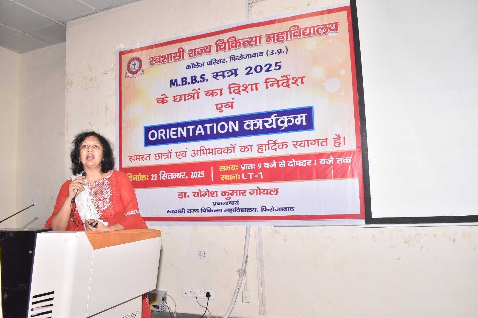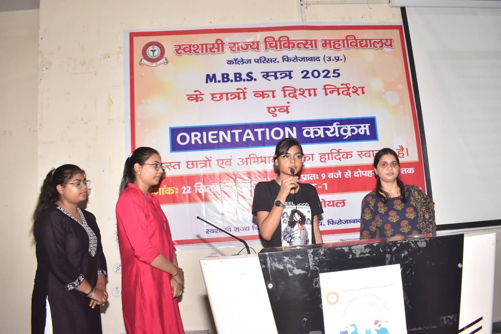 स्वशासी राज्य चिकित्सा महाविालय, फिरोजाबाद में दिनांक- 22.09.2025 को एम0बी0बी0एस0 सत्र-2025 बैच का शुभारम्भ ओरएन्टेशन कार्यक्रम के माध्यम से डॉ. योगेश कुमार गोयल, प्रधानाचार्य के मार्गदर्शन में किया गया। इस कार्यक्रम का मुख्य उद्देश्य छात्र-छात्राओं एवं अभिभावकों को स्वशासी राज्य चिकित्सा महाविद्यालय, फिरोजाबाद के कालेज एवं चिकित्सालय परिसर से अवगत कराना होता है। उक्त के दृष्टिगत विभिन्न विभागों एवं संकाय सदस्यों का परिचय, विभागाध्यक्ष, एनाटमी, फिजियोलॉजी, बायोकेमिस्ट्री के विचार प्रस्तुति, हॉस्टल एवं मैस का परिचय, एन्टी रैगिंग कमेटी एवं अनुशासन समिति द्वारा परिचय दिया गया। यह कालेज का 07 एम0बी0बी0एस0 बैच है। प्रथम एम0बी0बी0एस0 बैच-2019 इन्टर्नशिप करके उत्तीर्ण हो चुका है। हम इनके मंगल भविष्य की कामना करते है।